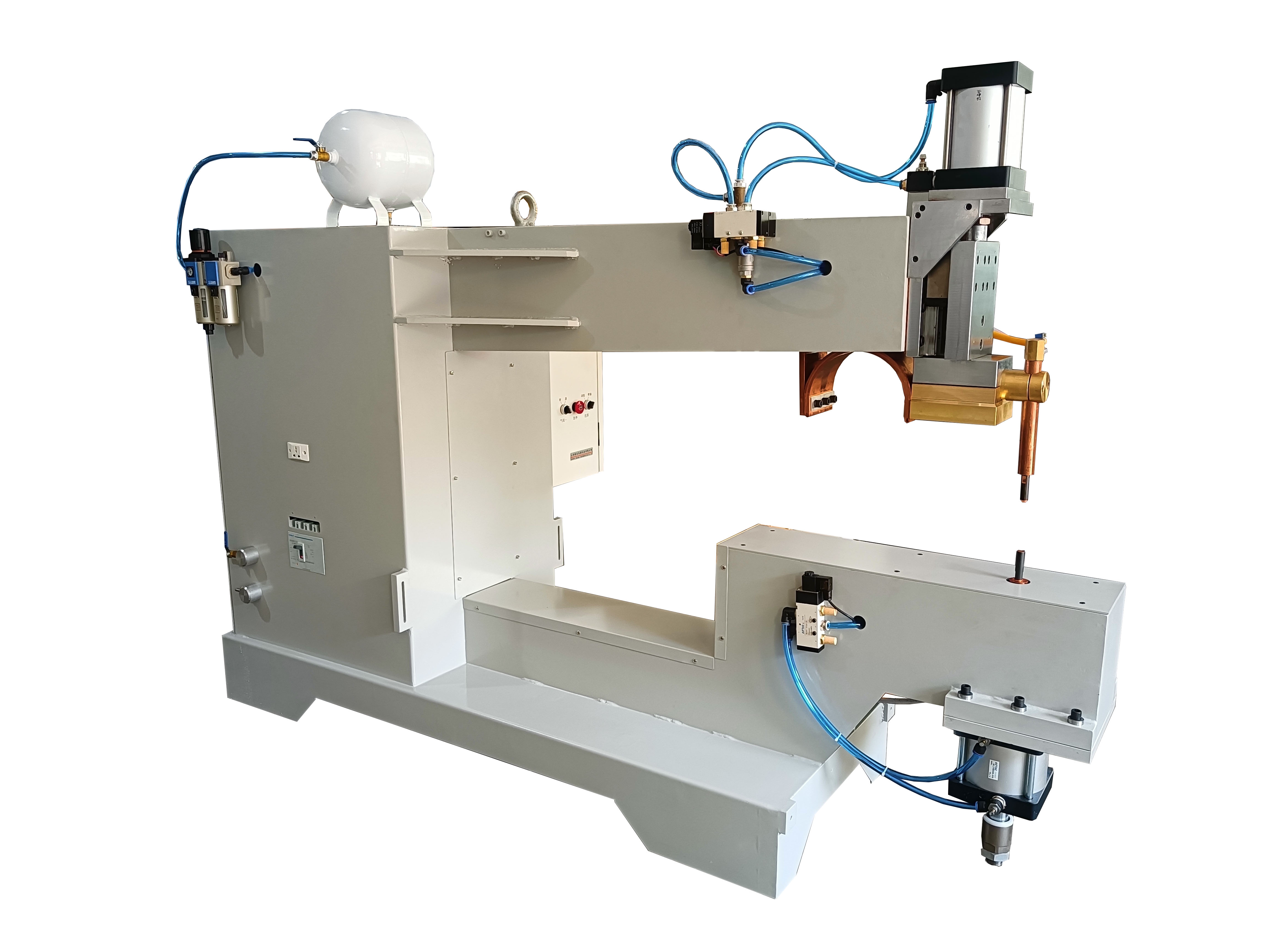 縫焊機(jī)就是指焊件裝配成搭接或?qū)咏宇^并放置于兩滾輪電極中間,滾輪電極加壓焊件并旋轉(zhuǎn),連續(xù)或斷續(xù)脈沖送電,形成一條連續(xù)焊縫的電阻焊機(jī)器。可以說,縫焊機(jī)是點(diǎn)焊中的一種演變。